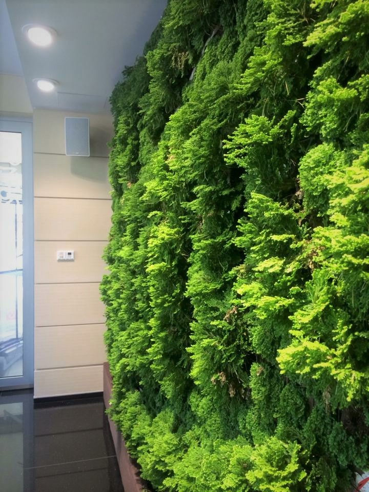 Those commercial spaces prominently features a biophilic design, creating a lush and inviting atmosphere that connects patrons with nature. The most striking feature is the abundant use of living plants, integrated as large vertical gardens or plant walls that cover significant portions of the walls. These green installations feature a variety of plant species, creating diverse textures and shades of green, from light to dark, and varying leaf shapes. This extensive use of plants brings the outdoors in, promoting a sense of calm and freshness. The combination of abundant plant life, natural light, and organic materials creates a serene and tranquil environment, offering a refreshing escape from urban settings and fostering a sense of well-being for its occupants.